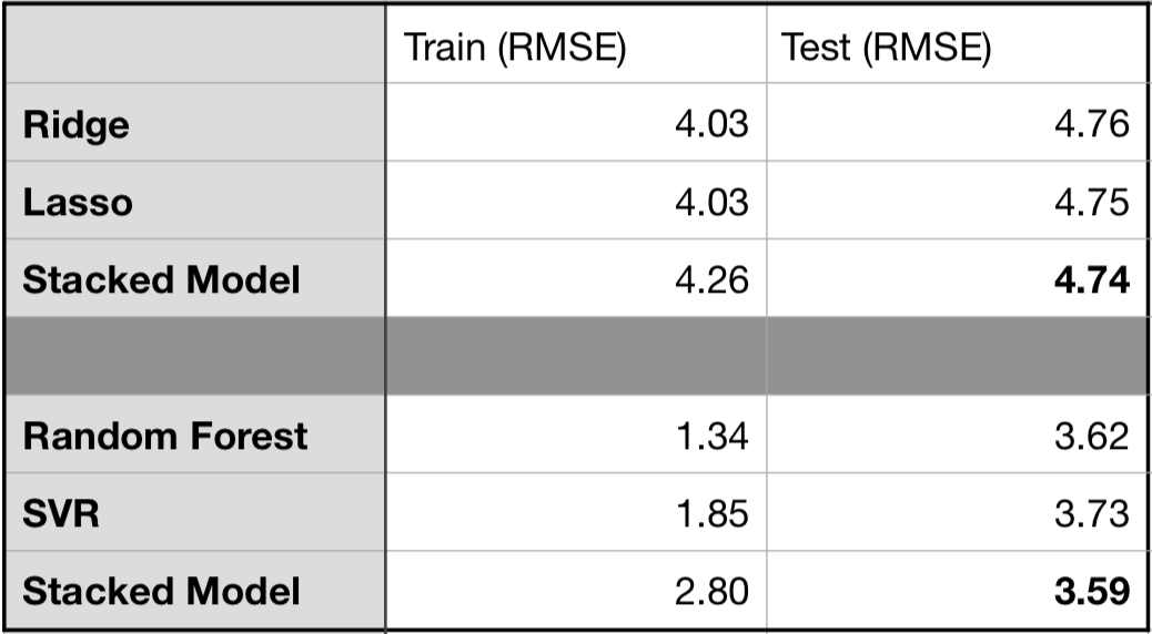 Stacking usually results in better performance, when the input models are quite different. This can actually be seen in the results above, where stacking two similar linear models (Lasso and Ridge) does not do as good as two different models (Random Forest and SVR). One way to check how different the initial models are is by computing the correlation between their prediction vectors.